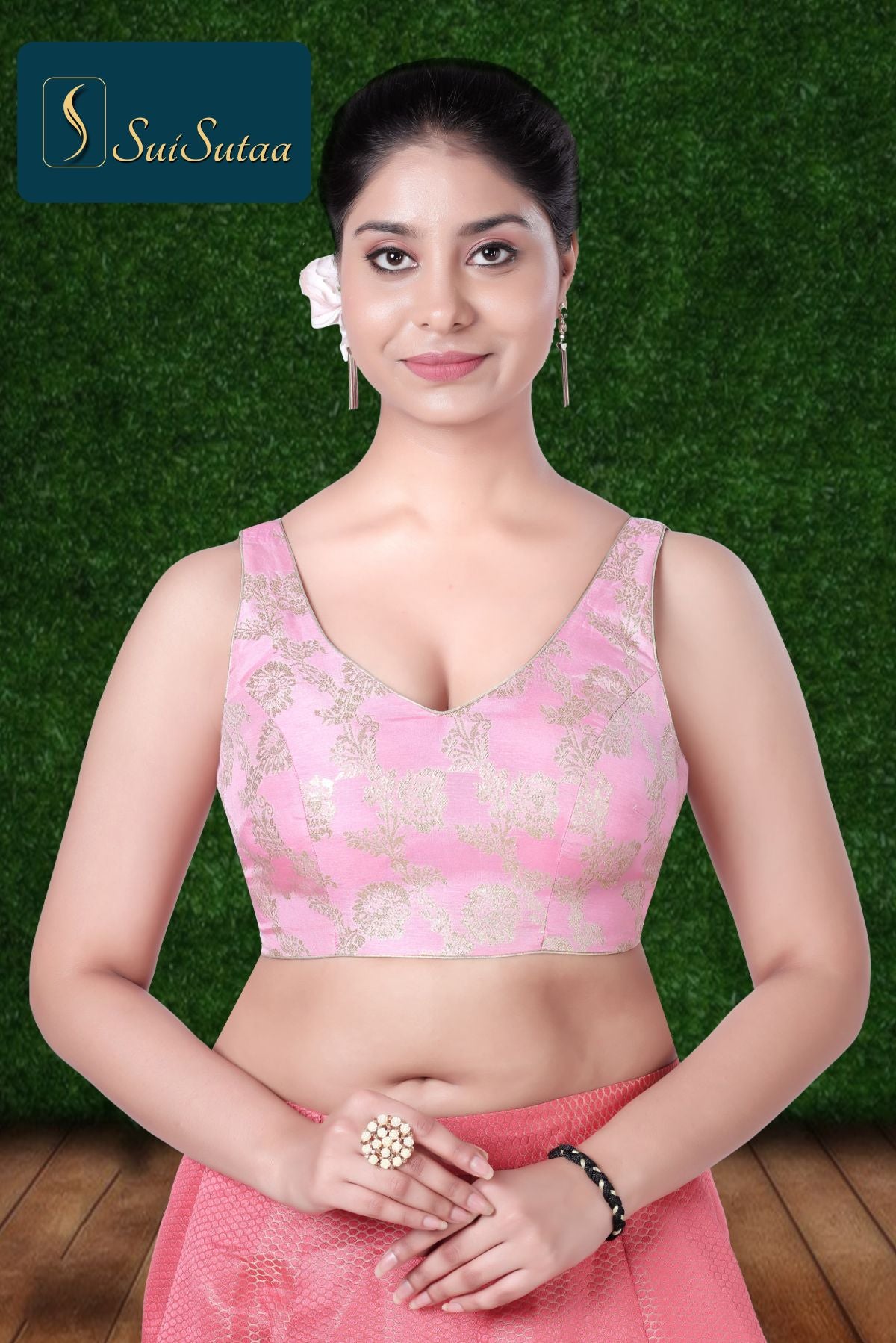 Description : This blouse is designed with padding and showcases a stunning print of golden leaves and flowers. This blouse boasts padding and showcases a lovely design of gilded leaves and blossoms.
