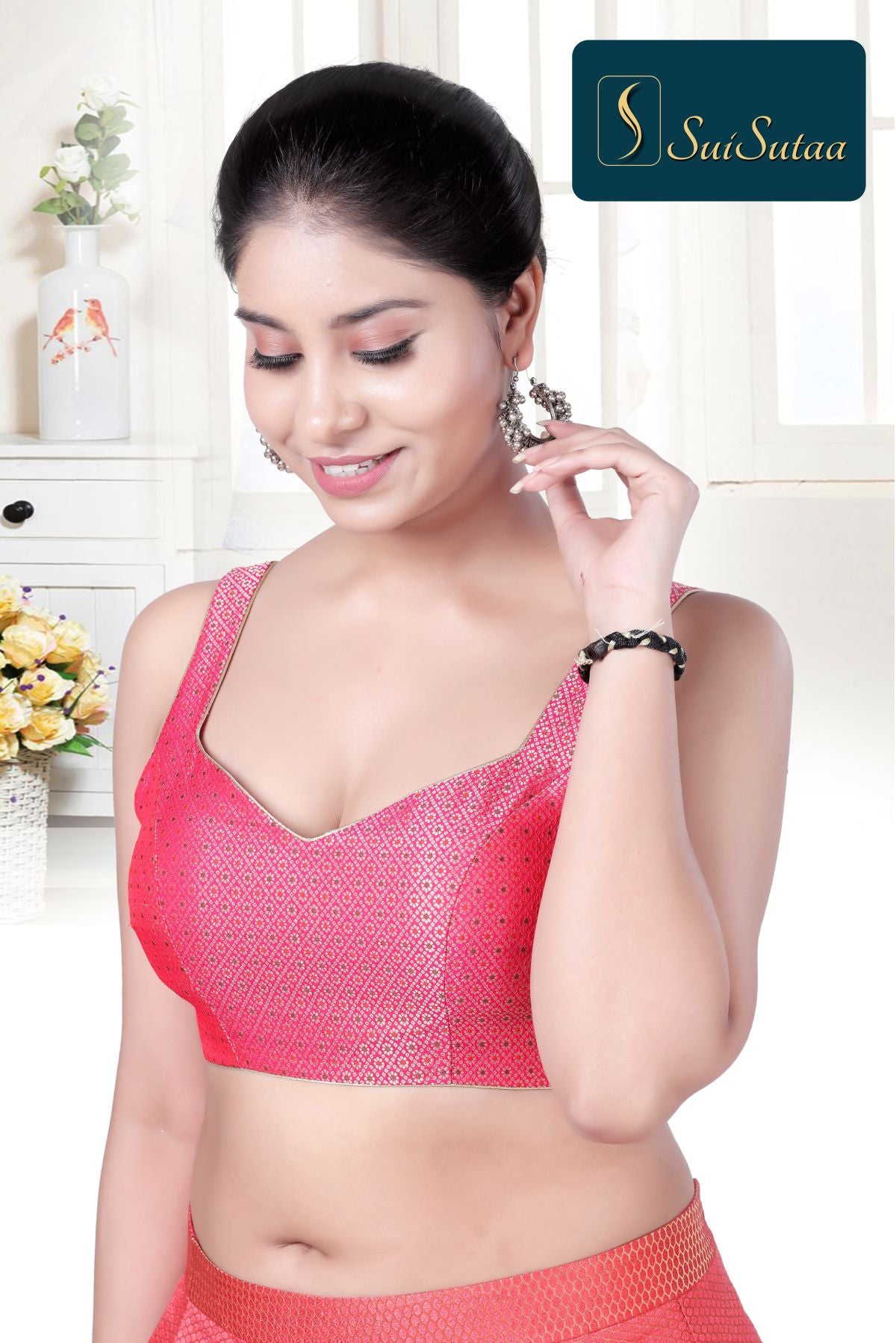 Product Description: This Silk Blouse features art silk golden jari work and a sleeveless curve V-neck design. The luxurious fabric and intricate detailing provide a high-end look, making it perfect for upscale events or adding a touch of elegance to your everyday wardrobe. Elevate your style with this versatile and timeless blouse.