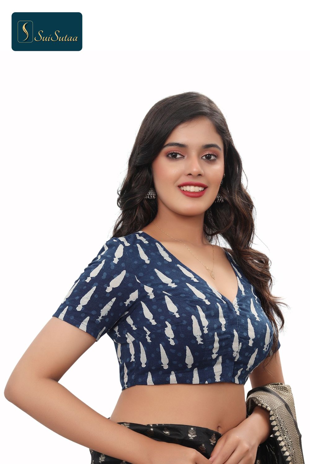 A chic blue blouse crafted from breathable printed cotton, featuring a flattering V‑neck and contemporary elbow‑length sleeves for balanced coverage.