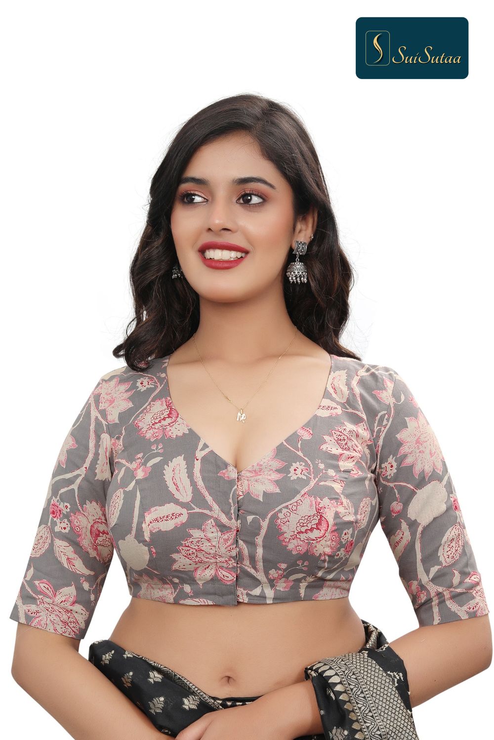 Enhance your ethnic wardrobe with this grey cotton print blouse, blending comfort with timeless elegance. Made from lining printed fabric and designed with elbow sleeves, it is perfect for a graceful and refined look on any occasion.