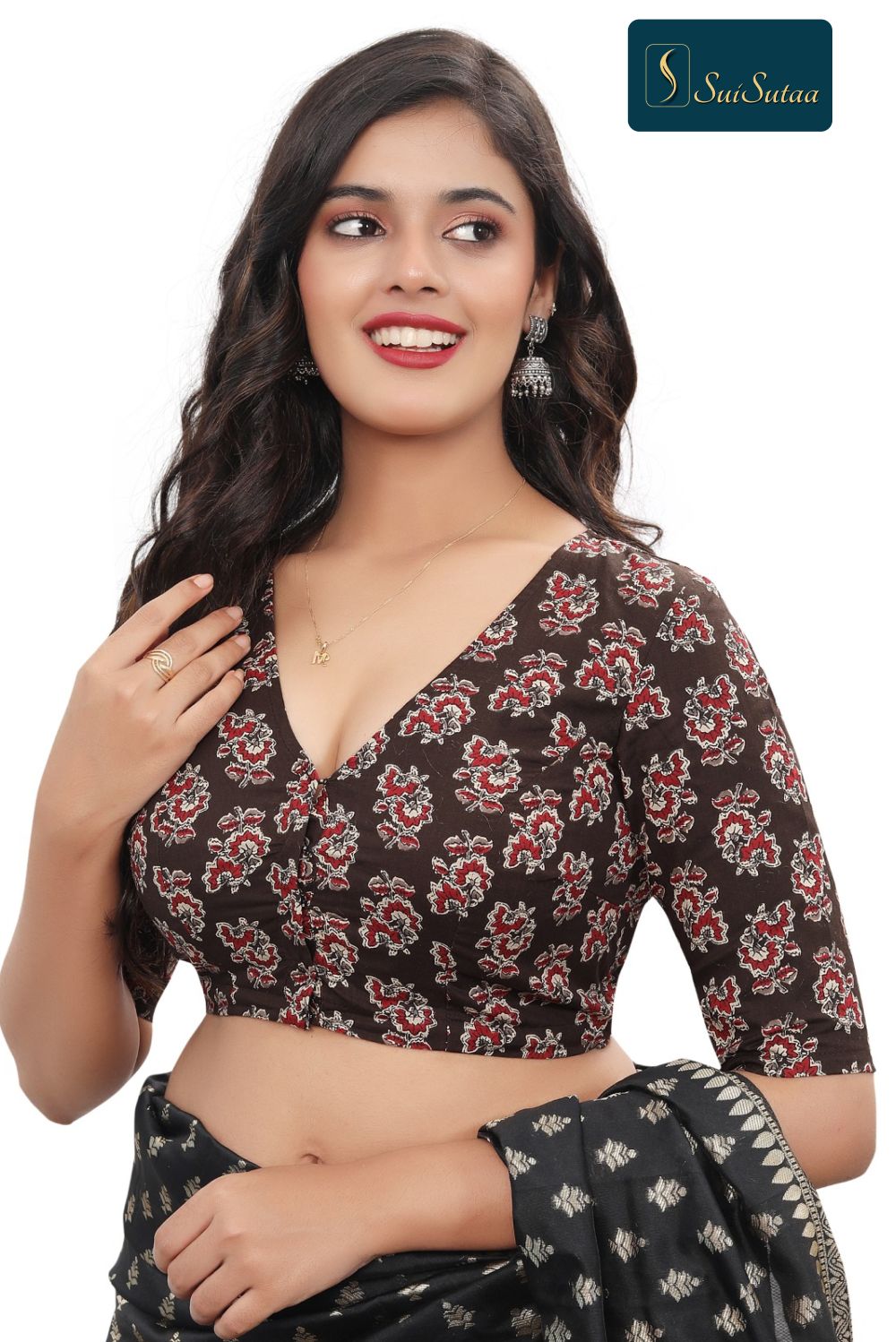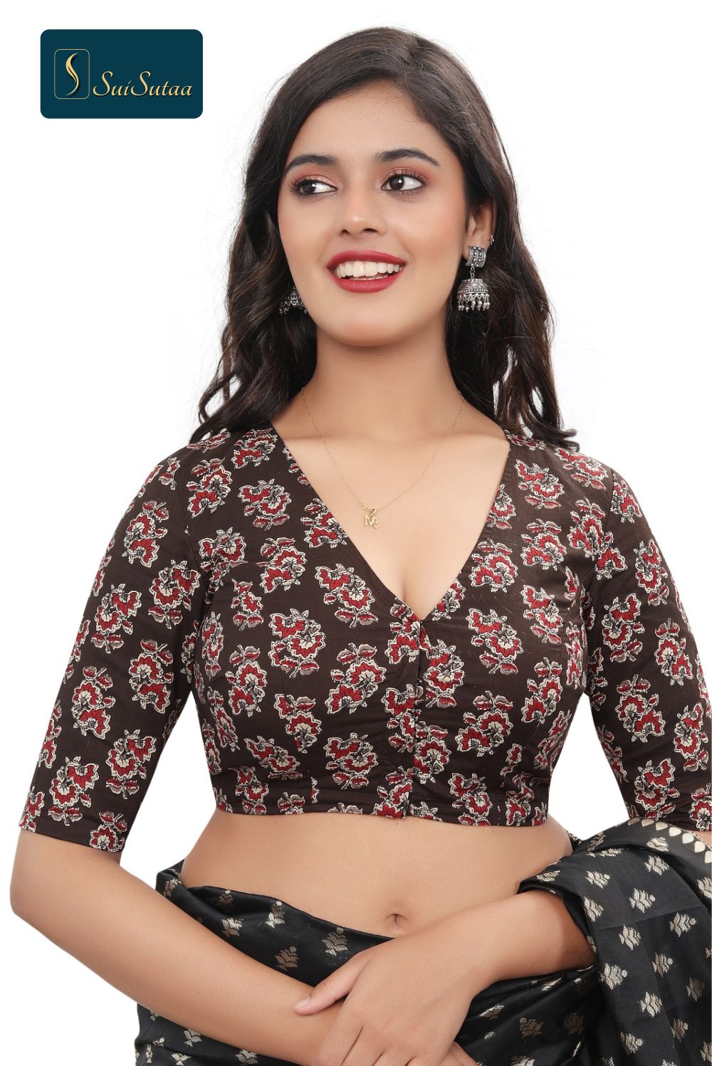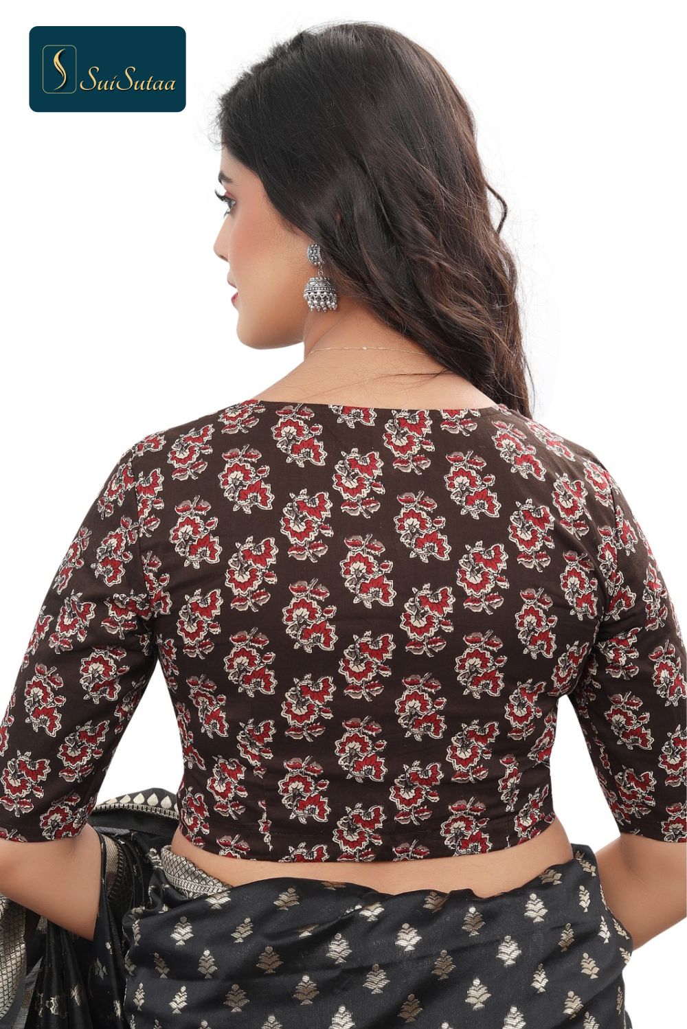 Add a warm, sophisticated touch to your ethnic wardrobe with this coffee cotton print blouse, designed for comfort and style. Featuring elbow sleeves and made from lining printed fabric, it’s perfect for pairing with a variety of sarees for a refined look.