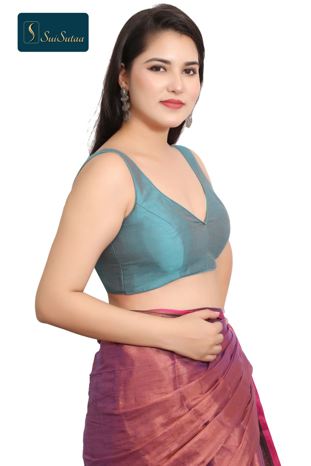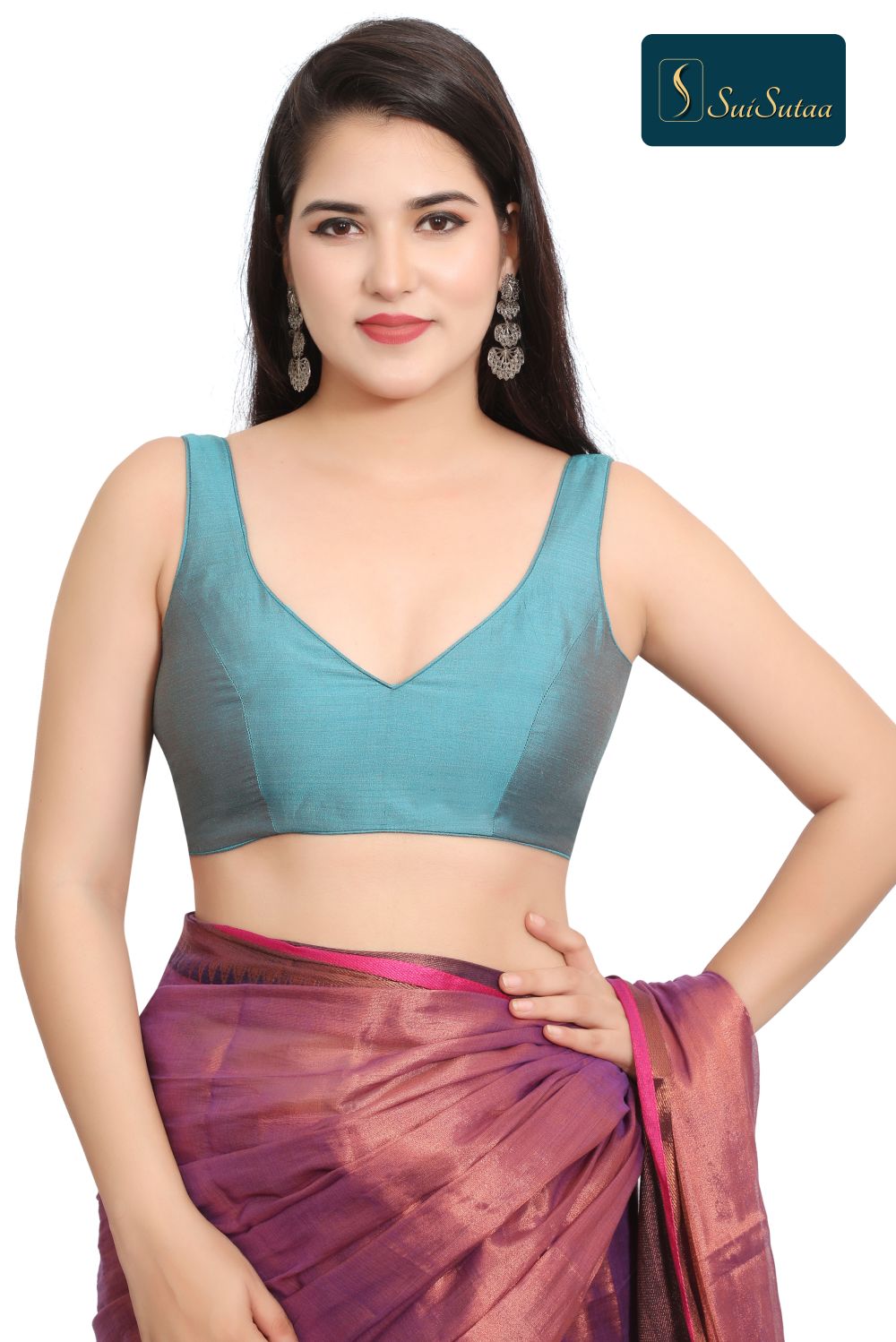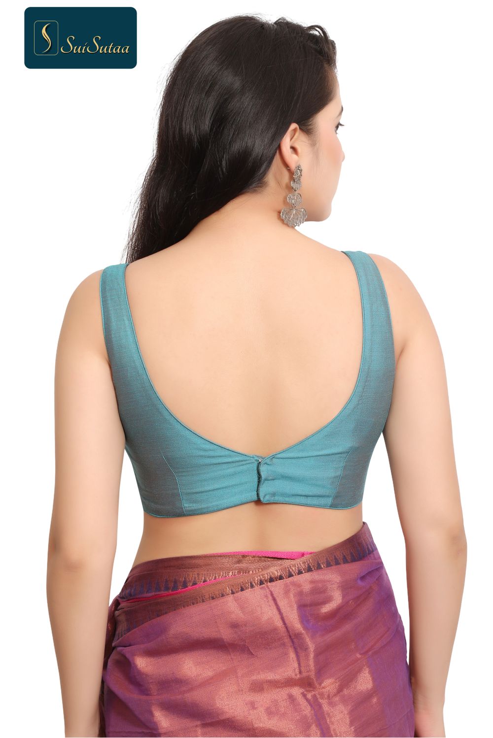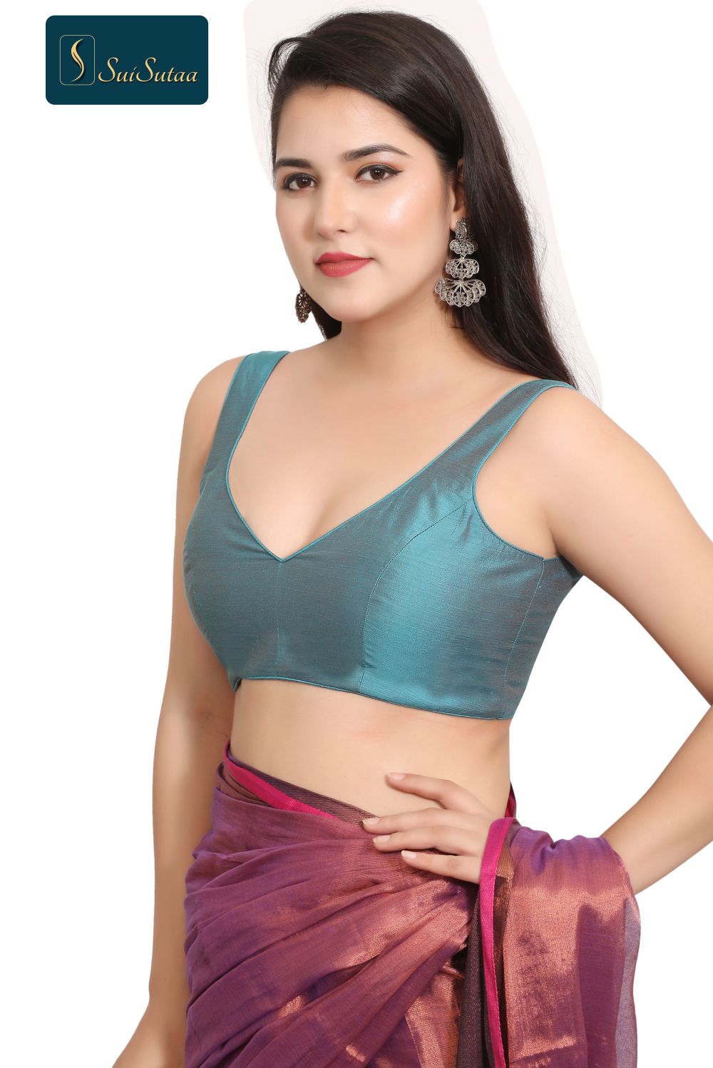 Step up your ethnic style with our chic Dark Ferozi Sleeveless Blouse, crafted in rich cotton silk for breathable comfort and luxurious sheen. This padded blouse features clean self-color piping for a minimal yet elegant look that pairs beautifully with sarees or lehengas.