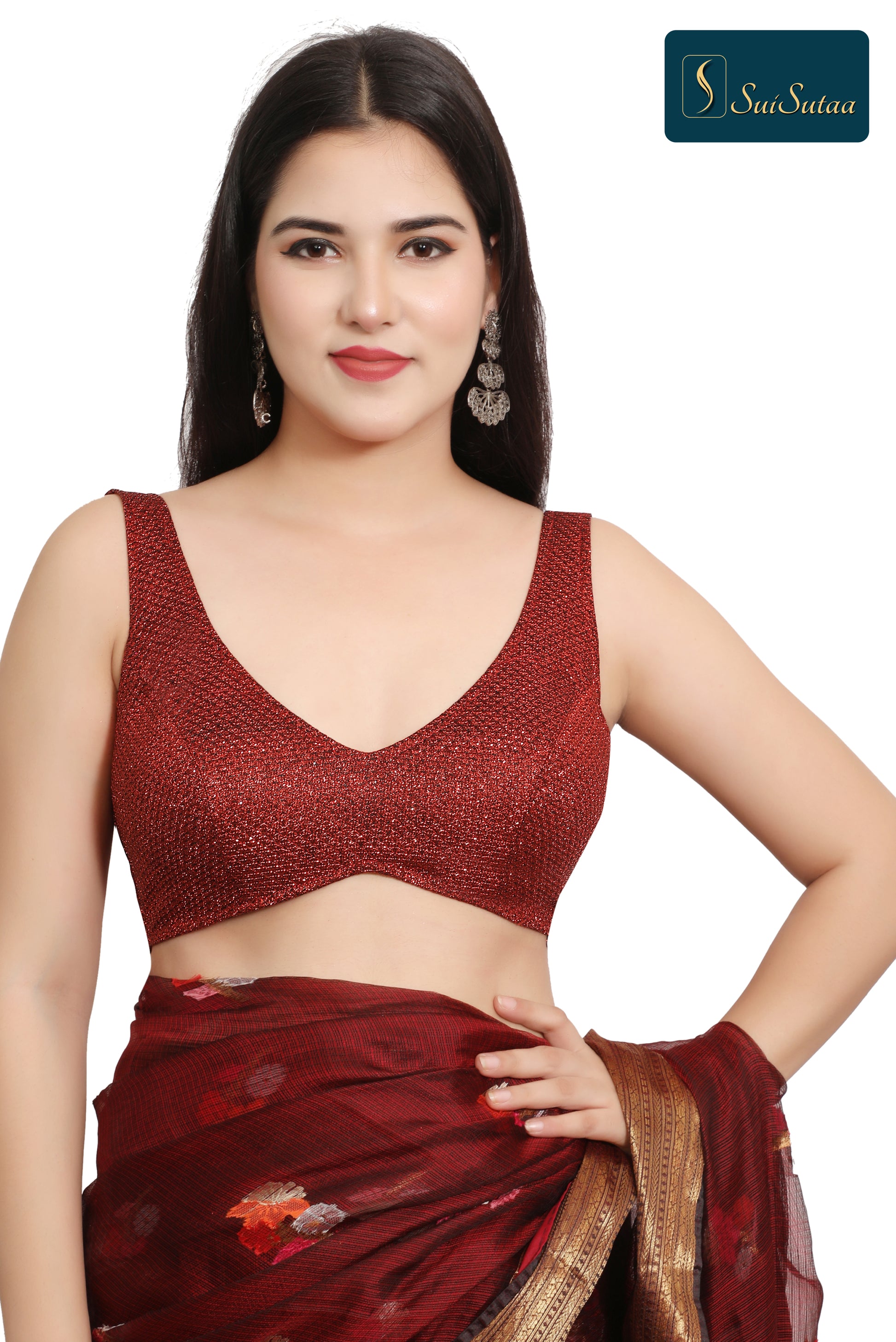 Add a touch of bold elegance to your ethnic collection with this Maroon Sleeveless Blouse crafted from premium Lycra fabric. Designed with a V-neckline and padded fit, it blends comfort with modern style. Perfect for pairing with sarees, lehengas, or skirts, this blouse is an essential for festive celebrations or formal gatherings.
