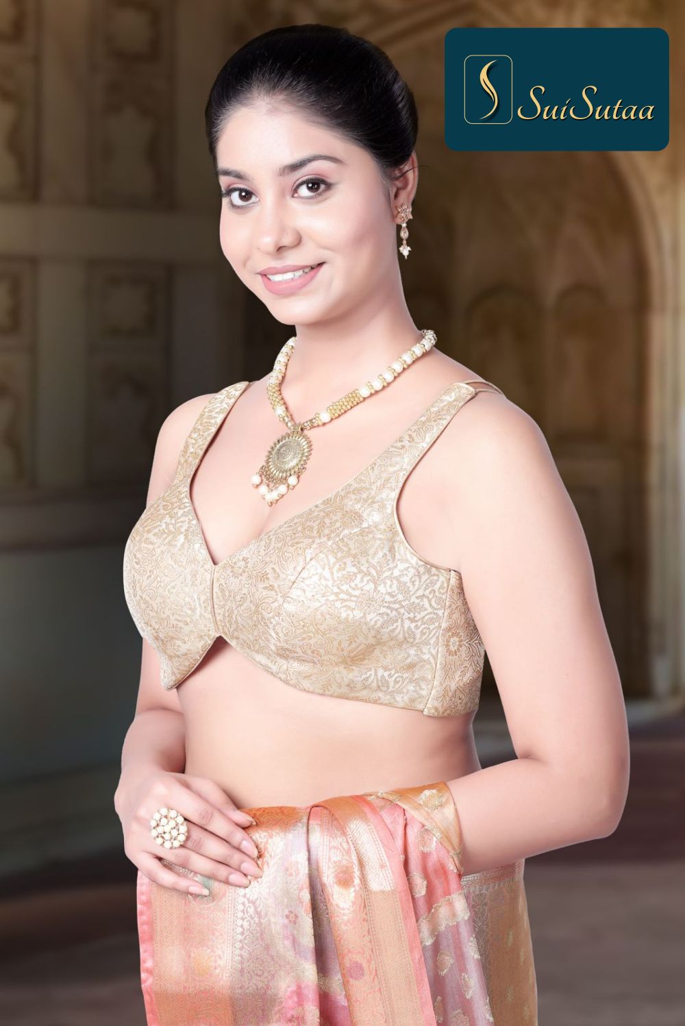 Product Description : This sleeveless blouse is expertly crafted with padding and adorned with elegant gold jari work, giving it a touch of luxury. The golden color adds a subtle yet sophisticated shine to any outfit. Elevate your wardrobe with this timeless piece.