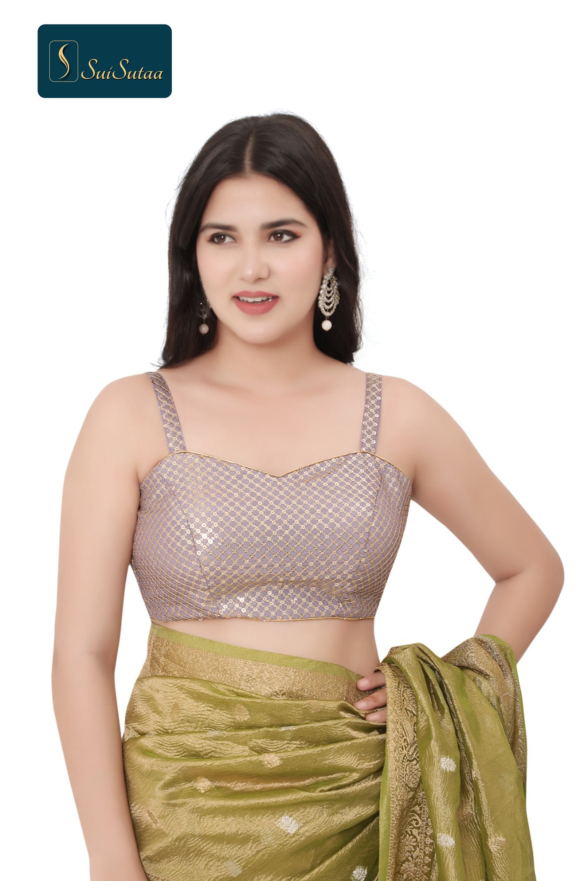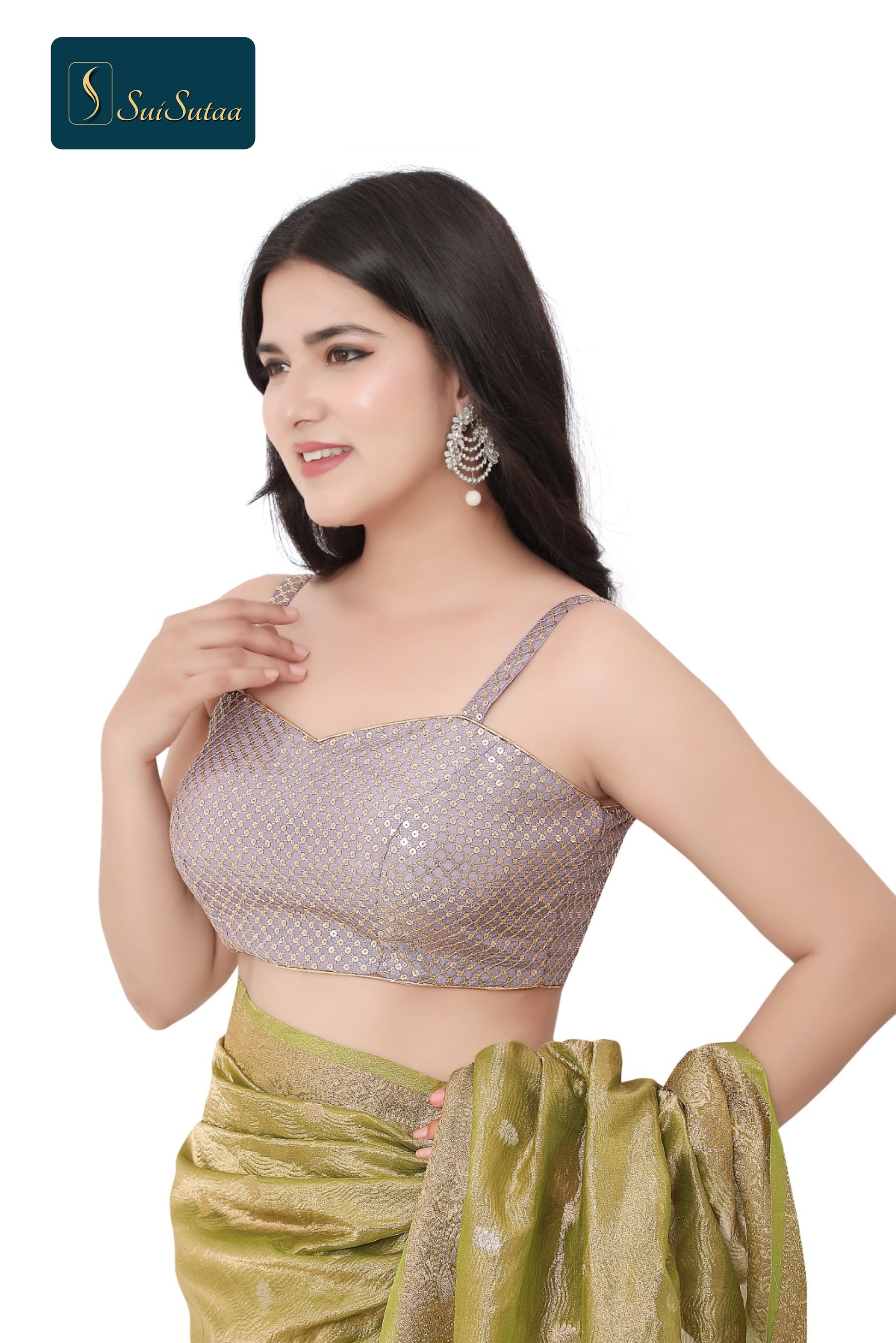 Enhance your ethnic wardrobe with the exquisite Spekety Blouse, crafted from delicate organza tissue fabric in a soothing light purple shade. This stunning blouse is designed to offer both elegance and comfort, featuring padded cups for a perfect fit and adorned with intricate gold jagi and tikki work for a regal touch.