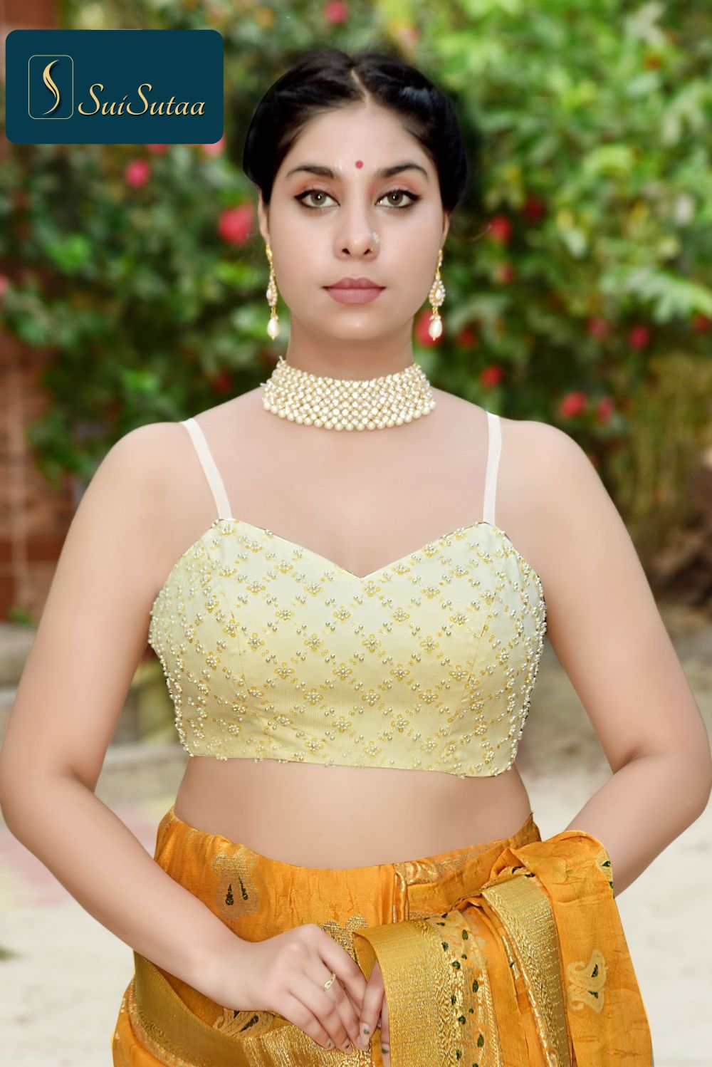 Brighten your ethnic wardrobe with this radiant yellow net spaghetti blouse, featuring delicate same-color motti and tikki work that creates subtle texture and dimension. The padded design ensures comfort while maintaining a flattering silhouette, making it perfect for both festive and formal occasions.