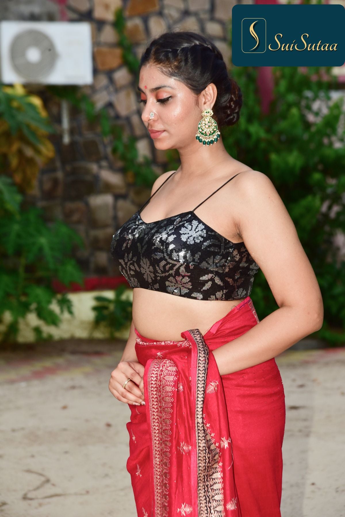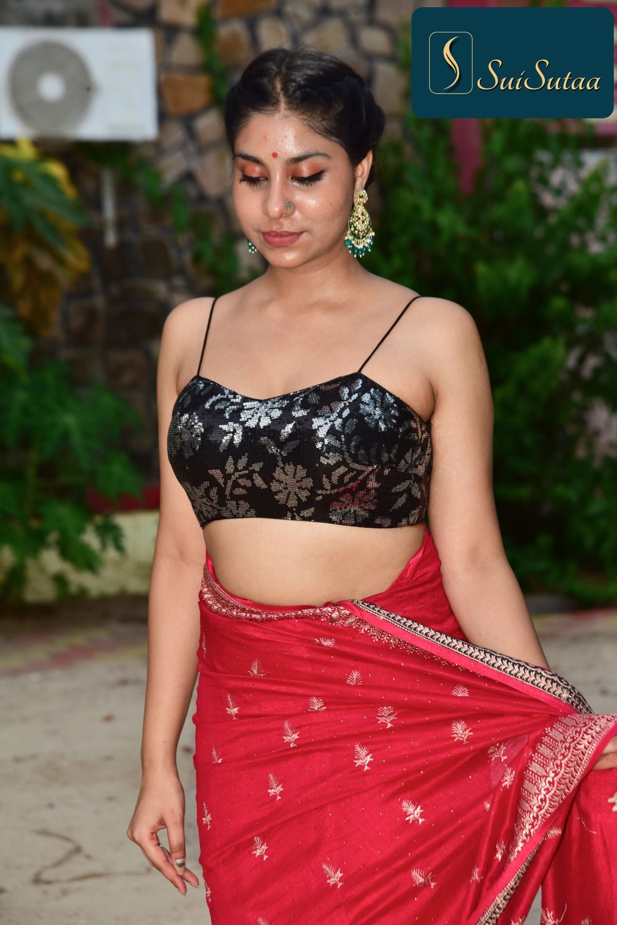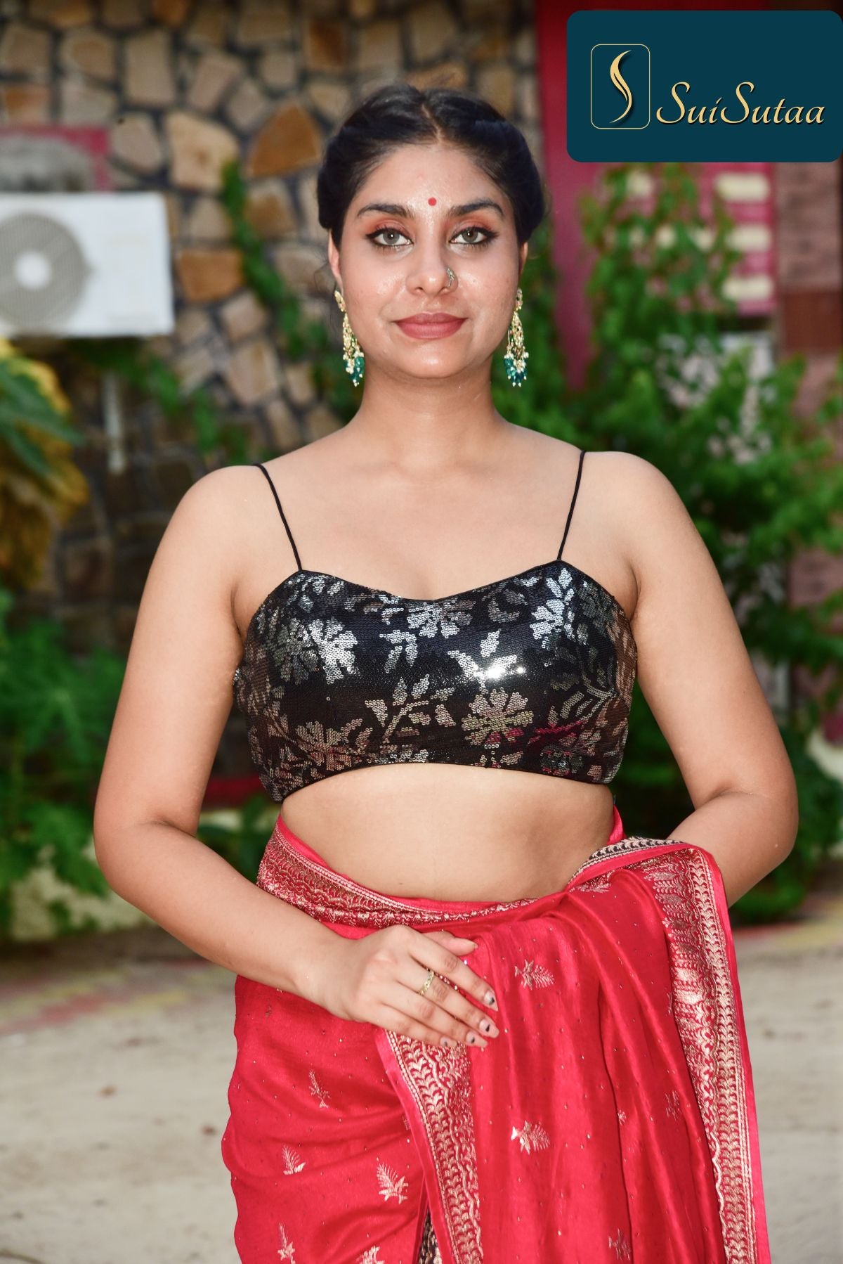 Drape yourself in sophistication with this black sequinned spaghetti blouse, where contemporary design meets traditional craftsmanship. The contrast black piping and dori strap detailing add dimensional interest to the shimmering sequin fabric, creating a blouse that's both edgy and elegant.